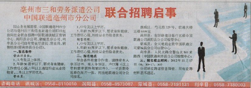 聯(lián)通公司招聘啟事